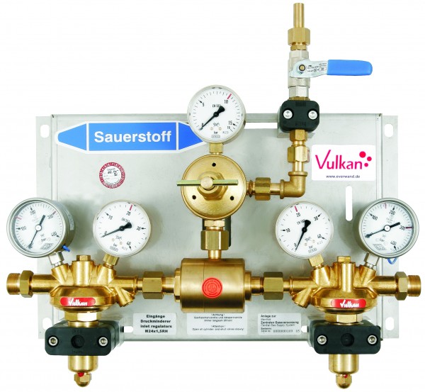 Automatic switching manifold Vulkan TecLine AM 35/300 K Effect. Complete on stainless steel base plate including: 2× manifold regulator H20 Effect acc. to ISO 7291 (adiabatic compression tested) 1× in-line regulator AD 35 1× automatic change-over block, 1× main shut-off valve. 2× contact gauges acc. to DIN EN 837-1 with Reed switch. Inlet pressure max 300 bar, outlet pressure 0–10 bar. Max. flow 50 Nm³/h. Diaphragm: PTFE. Dimensions: 530 × 400 × 210 mm.