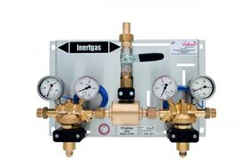 Automatic switching manifold Vulkan TecLine AM 35/300 KH Effect. Complete on stainless steel base plate including: 2× manifold regulator H20 Effect acc. to ISO 7291 (adiabatic compression tested) 1× automatic change-over block, 1× main shut-off valve. 2× contact gauges acc. to DIN EN 837-1 with Reed switch. Inlet pressure max 300 bar, outlet pressure 0–20 bar. Max. flow 75 Nm³/h. Diaphragm: PTFE. Dimensions: 450 × 340 × 210 mm.