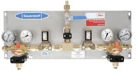 Automatic switching manifold Vulkan TecLine AM 35/300 KHM Effect. Complete on stainless steel base plate including: 2× manifold regulator H20 Effect acc. to ISO 7291 (adiabatic compression tested) 2× solenoid valves 24V AC, normally closed 1× automatic change-over block, 1× main shut-off valve. 2× contact gauges acc. to DIN EN 837-1 with Reed switch. Inlet pressure max 300 bar, outlet pressure 0–20 bar. Max. flow 75 Nm³/h. Diaphragm: PTFE. Dimensions: 690 × 350 × 210 mm.