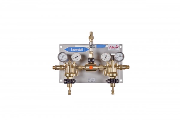 Automatic switching manifold Vulkan TecLine AM 55/300 K Effect. Complete on stainless steel base plate including: 2× manifold fin regulator HR40 Effect acc. to ISO 7291 (adiabatic compression tested) 1× automatic change-over block, 1× main shut-off valve. 2× contact gauges acc. to DIN EN 837-1 with Reed switch. Inlet pressure max 300 bar, outlet pressure 0–28 bar. Max. flow 250 Nm³/h. Diaphragm: Rubber (SS for O₂). Dimensions: 500 × 380 × 230 mm.