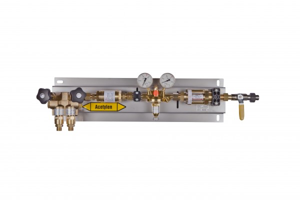 Manual manifold base station for acetylene bundles Vulkan TecLine BSA 10 B. Complete on stainless steel base plate acc. to ISO 14114: 1× distributing block Modula Vareo with automatic quick cut-off valve acc. to ISO 15615, 1× flashback arrestor acc. to ISO 5175, 1× manifold fin regulator HA10 acc. to ISO 7291, 1× main shut-off valve. Manual switching. Inlet max 26 bar, outlet 0–1.5 bar. Max. flow 10 Nm³/h. Dimensions: 850 × 250 × 210 mm, 15 kg.