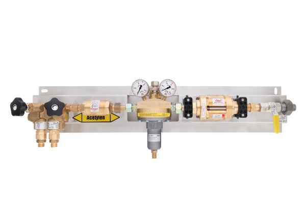 Manual manifold base station for acetylene bundles Vulkan TecLine BSA 40 B. Complete on stainless steel base plate acc. to ISO 14114: 1× distributing block Modula Vareo with automatic quick cut-off valve acc. to ISO 15615, 1× flashback arrestor acc. to ISO 5175, 1× manifold fin regulator HA40 acc. to ISO 7291, 1× main shut-off valve. Manual switching. Inlet max 26 bar, outlet 0–1.5 bar. Max. flow 38 Nm³/h. Dimensions: 980 × 275 × 210 mm, 26 kg.