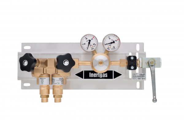 Manual manifold base station Vulkan TecLine BS 200/300. Modular add-on system (Modula Vareo). Complete on stainless steel base plate: 1× distributing block Modula Vareo (2 inlets, shut-off valves, non-return valves, sinter-metal filters), 1× manifold manifold regulator LHR 300/200 acc. to ISO 7291 (adiabatic compression tested), 1× main shut-off valve. Manual switching. Inlet max 300 bar, outlet 15–200 bar. Max. flow 480 Nm³/h at 200 bar. Dimensions: 590 × 330 × 285 mm, 12 kg.