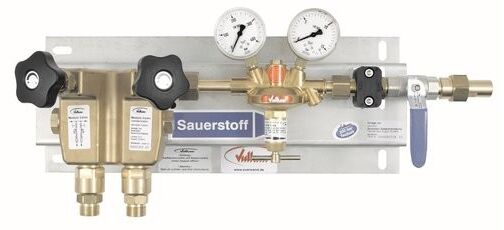 Manual manifold base station Vulkan TecLine BS 50/300. Modular add-on system (Modula Vareo). Complete on stainless steel base plate: 1× distributing block Modula Vareo (2 inlets, shut-off valves, non-return valves, sinter-metal filters), 1× manifold fin regulator H10 Effect acc. to ISO 7291 (adiabatic compression tested), 1× main shut-off valve. Manual switching. Inlet max 300 bar, outlet 0–10 bar. Max. flow 50 Nm³/h at 10 bar. Dimensions: 570 × 250 × 210 mm, 10 kg.