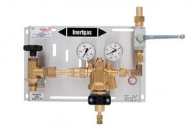 Single-bundle manifold station Vulkan TecLine EB100/300. Complete on stainless steel base plate, with HP shut-off valve, manifold fin regulator HR40 acc. to ISO 7291 (adiabatic compression tested), and main shut-off valve. Manual switching. Inlet pressure max 300 bar, outlet pressure 15–40 bar. Max. flow 290 Nm³/h at 40 bar. With standard pressure gauges. Dimensions: 440 × 370 × 130 mm, N/A kg.
