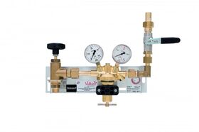 Single-bundle manifold station Vulkan TecLine EB70/300. Complete on stainless steel base plate, with HP shut-off valve, manifold fin regulator HR40 acc. to ISO 7291 (adiabatic compression tested), and main shut-off valve. Manual switching. Inlet pressure max 300 bar, outlet pressure 0–40 bar. Max. flow 120 Nm³/h at 40 bar. With standard pressure gauges. Dimensions: N/A mm, N/A kg.