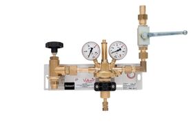 Single-bundle manifold station Vulkan TecLine EB75/300. Complete on stainless steel base plate, with HP shut-off valve, manifold fin regulator HR60 acc. to ISO 7291 (adiabatic compression tested), and main shut-off valve. Manual switching. Inlet pressure max 300 bar, outlet pressure 0–60 bar. Max. flow 140 Nm³/h at 60 bar. With standard pressure gauges. Dimensions: 370 × 280 × 110 mm, N/A kg.