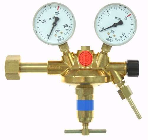 Vulkan F10/200 Effect compressed air cylinder pressure reducer DIN 477-1, 0-10 bar according to ISO 2503 with pre-pressure compensation for constant back pressure under all operating conditions, single-stage design, with shut-off valve, with safety pressure gauges according to DIN EN ISO 5171, maximum inlet pressure: 200 bar, outlet pressure: 0-10 bar adjustable, maximum output: 48 Nm³/h compressed air at 10 bar back pressure. Inlet: G 5/8 RHaf connection screw according to DIN 477-1 No. 13, Outlet (optional special outlet): G 1/4 RHk x 6 mm nozzle according to EN 560, input pressure gauge: 0-315/200 bar, output pressure gauge: 0-16/10 bar, width x height x depth: 210 x 190 x 75 mm. This cylinder pressure reducer is available in the following versions, among others: Gas purity/membrane: Standard:- for technical gases up to a gas purity of 4.5 with standard membrane Optional (surcharge):- for pure gases up to a gas purity of 5.0 with stainless steel membrane SS321 (1.4541) Special outlet screw connection: Standard:- G1/4 RHk x 6 mm nozzle according to EN 560 Options (surcharge): Item numberGas purityOutlet connection 207005 for technical gases up to 4.5, with standard membrane Hose nozzle G1/4" RHk x 6mm 207005-812 for technical gases up to 4.5, with standard membrane Hose nozzle G3/8" RHk x 9mm 207005-800 for technical gases up to 4.5, with standard membrane External thread G1/4" RHk according to EN560 207005-870 for technical gases up to 4.5, with Standard membrane external thread G3/8" RHk according to EN 560 207005-838 for technical gases up to 4.5, with standard membrane external thread G1/2" RHk according to EN 560 207005-6M for technical gases up to 4.5, with standard membrane compression fitting VA 6mm 207005-8M for technical gases up to 4.5, with standard membrane compression fitting VA 8mm 207005-10M for technical gases up to 4.5, with standard membrane compression fitting VA 10mm 207005-12M for technical gases up to 4.5, with standard membrane compression fitting VA 12mm 207005-2 for technical gases up to 4.5, with standard membrane compression fitting VA 1/8" 207005-4 for technical gases up to 4.5, with standard diaphragm compression fitting VA 1/4" 207005-MM for pure gases up to 5.0, with metal diaphragm SS321 (1.4541) hose nozzle G1/4" RHk x 6mm 207005-MM-812 for pure gases up to 5.0, with metal diaphragm SS321 (1.4541) hose nozzle G3/8" RHk x 9mm 207005-MM-800 for pure gases up to 5.0, with metal diaphragm SS321 (1.4541) external thread G1/4" RHk according to EN560 207005-MM-870 for pure gases up to 5.0, with metal diaphragm SS321 (1.4541) external thread G3/8" RHk according to EN 560 207005-MM-838 for pure gases up to 5.0, with metal membrane SS321 (1.4541) external thread G1/2" RHk according to EN 560 207005-MM-6M for pure gases up to 5.0, with metal membrane SS321 (1.4541) compression fitting VA 6mm 207005-MM-8M for pure gases up to 5.0, with metal membrane SS321 (1.4541) compression fitting VA 8mm 207005-MM-10M for pure gases up to 5.0, with metal membrane SS321 (1.4541) compression fitting VA 10mm 207005-MM-12M for pure gases up to 5.0, with metal membrane SS321 (1.4541) compression fitting VA 12mm 207005-MM-2 for pure gases up to 5.0, with metal membrane SS321 (1.4541) compression fitting VA 1/8" 207005-MM-4 for pure gases up to 5.0, with metal membrane SS321 (1.4541) compression fitting VA 1/4"
