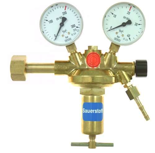Vulkan F20/200 Effect Oxygen cylinder pressure reducer DIN 477-1, 0-20 bar according to ISO 2503, Class 5, single-stage design, burnout tested according to ISO 2503, with pre-pressure compensation for constant outlet pressure with falling pre-pressure, with safety gauges according to DIN EN ISO 5171, with shut-off valve. Maximum inlet pressure: 200 bar. Output pressure: 0-20 bar adjustable. Maximum output: 75 Nm³/h at 20 bar outlet pressure. Inlet: G3/4RH U-nut according to DIN 477-1 No. 9. Outlet (optional special outlet): G1/4RHk x 6 mm nozzle according to EN 560. Inlet gauge: 0-315/200 bar. Outlet gauge: 0-40/20 bar. Width x Height x Depth: 210 x 210 x 75 mm. This cylinder pressure reducer is available in the following versions, among others: Gas purity/diaphragm: Standard: - for technical gases up to a gas purity of 4.5 with standard membrane Optional (surcharge): - for pure gases up to a gas purity of 5.0 with stainless steel membrane SS321 (1.4541) Special outlet screw connection: Standard: - G1/4 RHk x 6 mm nozzle according to EN 560 Options (surcharge): Item number Gas purity Outlet connection 208300 for technical gases up to 4.5, with standard membrane Hose nozzle G1/4" RHk x 6mm 208300-812 for technical gases up to 4.5, with standard membrane Hose nozzle G3/8" RHk x 9mm 208300-800 for technical gases up to 4.5, with standard membrane External thread G1/4" RHk according to EN560 208300-870 for technical gases up to 4.5, with standard membrane, external thread G3/8" RHk according to EN 560 208300-838 for technical gases up to 4.5, with standard membrane, external thread G1/2" RHk according to EN 560 208300-6M for technical gases up to 4.5, with standard membrane, compression fitting VA 6mm 208300-8M for technical gases up to 4.5, with standard membrane, compression fitting VA 8mm 208300-10M for technical gases up to 4.5, with standard membrane, compression fitting VA 10mm 208300-12M for technical gases up to 4.5, with standard membrane, compression fitting VA 12mm 208300-2 for technical gases up to 4.5, with standard membrane Compression fitting VA 1/8" 208300-4 for technical gases up to 4.5, with standard membrane Compression fitting VA 1/4" 208300-MM for pure gases up to 5.0, with metal membrane SS321 (1.4541) Hose nozzle G1/4" RHk x 6mm 208300-MM-812 for pure gases up to 5.0, with metal membrane SS321 (1.4541) Hose nozzle G3/8" RHk x 9mm 208300-MM-800 for pure gases up to 5.0, with metal membrane SS321 (1.4541) external thread G1/4" RHk according to EN560 208300-MM-870 for pure gases up to 5.0, with metal membrane SS321 (1.4541) external thread G3/8" RHk according to EN 560 208300-MM-838 for pure gases up to 5.0, with metal membrane SS321 (1.4541) external thread G1/2" RHk according to EN 560 208300-MM-6M for pure gases up to 5.0, with metal membrane SS321 (1.4541) compression fitting VA 6mm 208300-MM-8M for pure gases up to 5.0, with metal membrane SS321 (1.4541) compression fitting VA 8mm 208300-MM-10M for pure gases up to 5.0, with metal membrane SS321 (1.4541) compression fitting VA 10mm 208300-MM-12M for pure gases up to 5.0, with metal membrane SS321 (1.4541) compression fitting VA 12mm 208300-MM-2 for pure gases up to 5.0, with metal membrane SS321 (1.4541) compression fitting VA 1/8" 208300-MM-4 for pure gases up to 5.0, with metal membrane SS321 (1.4541) compression fitting VA 1/4"