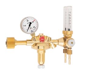 Vulkan F15/200 2F Argon cylinder pressure reducer with 2 flow meters, 0.5-5 Nl/min, 4.5 bar according to ISO 2503, Class 20. Single-stage design with two flow meters for monitoring the exact flow rate in Nl/min. With pre-pressure compensation for constant outlet pressure when the pre-pressure drops, with safety pressure gauge according to ISO 5171, and with shut-off valve. Maximum inlet pressure: 200 bar. Outlet pressure: 2 x 4.5 bar, fixed output. Output: 2 x 0.5 - 5.0 Nl/min. Ar/CO2 adjustable. Inlet: W 21.8 x 1/14 RH U-nut according to DIN 477-1, No. 6. Outlet: 2x G 1/4 RHk x 6mm nozzle according to EN 560. Inlet pressure gauge: 0 - 315/200 bar. Width x Height x Depth: 250 x 230 x 75 mm. Gas purity/membrane: Standard: - for technical gases up to a gas purity of 4.5 with a standard membrane. Optional (surcharge): - for pure gases up to a gas purity of 5.0 with a stainless steel membrane SS321 (1.4541).