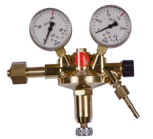 Vulkan F15/200 2F Effect 2 cylinder pressure reducer with flowmeter H2 3-32 Nl/min. 4.5 bar according to ISO 2503, Class 20. Single-stage design with two flowmeters for monitoring the exact flow rate in Nl/min. With pre-pressure compensation for constant back pressure when the pre-pressure drops. With safety pressure gauge according to ISO 5171 and shut-off valve. Maximum inlet pressure: 200 bar. Outlet pressure: 2 x 4.5 bar, fixed output. Output: 2 x 3.0 - 32.0 Nl/min. Hydrogen adjustable. Inlet: W21.8x1/14LH U-nut according to DIN 477-1, No. 1. Outlet: 2x G 3/8LHk x 9mm nozzle according to DIN EN 560. Inlet pressure gauge: 0 - 315 / 200 bar. Width x Height x Depth: 210 x 230 x 75 mm. Gas purity/membrane: Standard: - for technical gases up to a gas purity of 4.5 with a standard membrane. Optional (surcharge): - for pure gases up to a gas purity of 5.0 with a stainless steel membrane SS321 (1.4541).