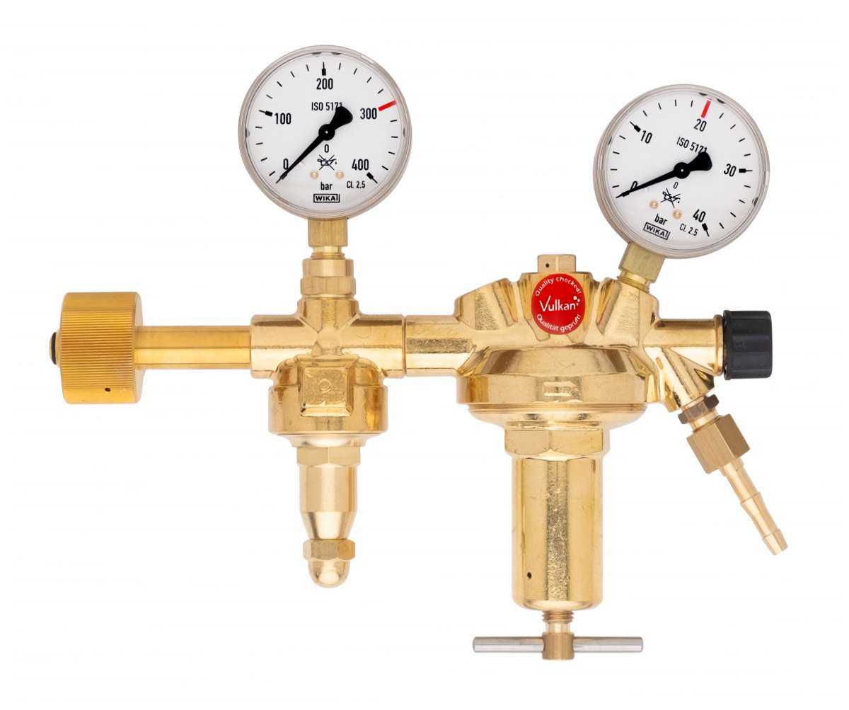 Vulkan F20/2 300 Effect Oxygen cylinder pressure reducer DIN 477-5, 0 - 20 bar according to ISO 2503, Class 5, two-stage design, first stage with metal diaphragm, with pre-pressure compensation for constant back pressure with falling back pressure, with safety gauges according to ISO 5171, with shut-off valve. Maximum inlet pressure: 300 bar. Output pressure: 0 - 20 bar adjustable. Maximum output: 60 Nm³/h air at 20 bar back pressure. Inlet: W 30x2 RH U-nut according to DIN 477-5 No. 59. Outlet: G 1/4 RHk x 6mm nozzle according to EN 560. Inlet gauge: 0 - 400/300 bar. Outlet gauge: 0 - 40/20 bar. Width x Height x Depth: 240 x 210 x 75 mm. Important note for 300 bar. Pressure reducers - Please check your cylinder connection! Cylinder pressure reducers for 300 bar have a manual connection according to DIN 477 Part 5 and are NOT backward compatible. This means they do NOT fit cylinders with a maximum filling pressure of 200 bar! If necessary, see our following tutorial, 3: Difference between 200 bar and 300 bar pressure reducers. This cylinder pressure reducer is available in the following versions, among others: Gas purity/diaphragm: Standard: - for technical gases up to a gas purity of 4.5 with standard membrane Optional (surcharge): - for pure gases up to a gas purity of 5.0 with stainless steel membrane SS321 (1.4541) Special outlet screw connection: Standard: - hose nozzle G1/4" RHk x 6mm Options (surcharge): Item number Gas purity Outlet connection 308230 for technical gases up to 4.5, with standard membrane Hose nozzle G1/4" RHk x 6mm 308230-812 for technical gases up to 4.5, with standard membrane Hose nozzle G3/8" RHk x 9mm 308230-800 for technical gases up to 4.5, with standard membrane External thread G1/4" RHk according to EN560 308230-870 for technical gases up to 4.5, with standard membrane, external thread G3/8" RHk according to EN 560 308230-838 for technical gases up to 4.5, with standard membrane, external thread G1/2" RHk according to EN 560 308230-6M for technical gases up to 4.5, with standard membrane, compression fitting VA 6mm 308230-8M for technical gases up to 4.5, with standard membrane, compression fitting VA 8mm 308230-10M for technical gases up to 4.5, with standard membrane, compression fitting VA 10mm 308230-12M for technical gases up to 4.5, with standard membrane, compression fitting VA 12mm 308230-2 for technical gases up to 4.5, with standard membrane Compression fitting VA 1/8" 308230-4 for technical gases up to 4.5, with standard membrane Compression fitting VA 1/4" 308230-MM for pure gases up to 5.0, with metal membrane SS321 (1.4541) Hose nozzle G1/4" RHk x 6mm 308230-MM-812 for pure gases up to 5.0, with metal membrane SS321 (1.4541) Hose nozzle G3/8" RHk x 9mm 308230-MM-800 for pure gases up to 5.0, with metal membrane SS321 (1.4541) external thread G1/4" RHk according to EN560 308230-MM-870 for pure gases up to 5.0, with metal membrane SS321 (1.4541) external thread G3/8" RHk according to EN 560 308230-MM-838 for pure gases up to 5.0, with metal membrane SS321 (1.4541) external thread G1/2" RHk according to EN 560 308230-MM-6M ​​for pure gases up to 5.0, with metal membrane SS321 (1.4541) compression fitting VA 6mm 308230-MM-8M for pure gases up to 5.0, with metal membrane SS321 (1.4541) compression fitting VA 8mm 308230-MM-10M for pure gases up to 5.0, with metal membrane SS321 (1.4541) compression fitting VA 10mm 308230-MM-12M for pure gases up to 5.0, with metal membrane SS321 (1.4541) compression fitting VA 12mm 308230-MM-2 for pure gases up to 5.0, with metal membrane SS321 (1.4541) compression fitting VA 1/8" 308230-MM-4 for pure gases up to 5.0, with metal membrane SS321 (1.4541) compression fitting VA 1/4"
