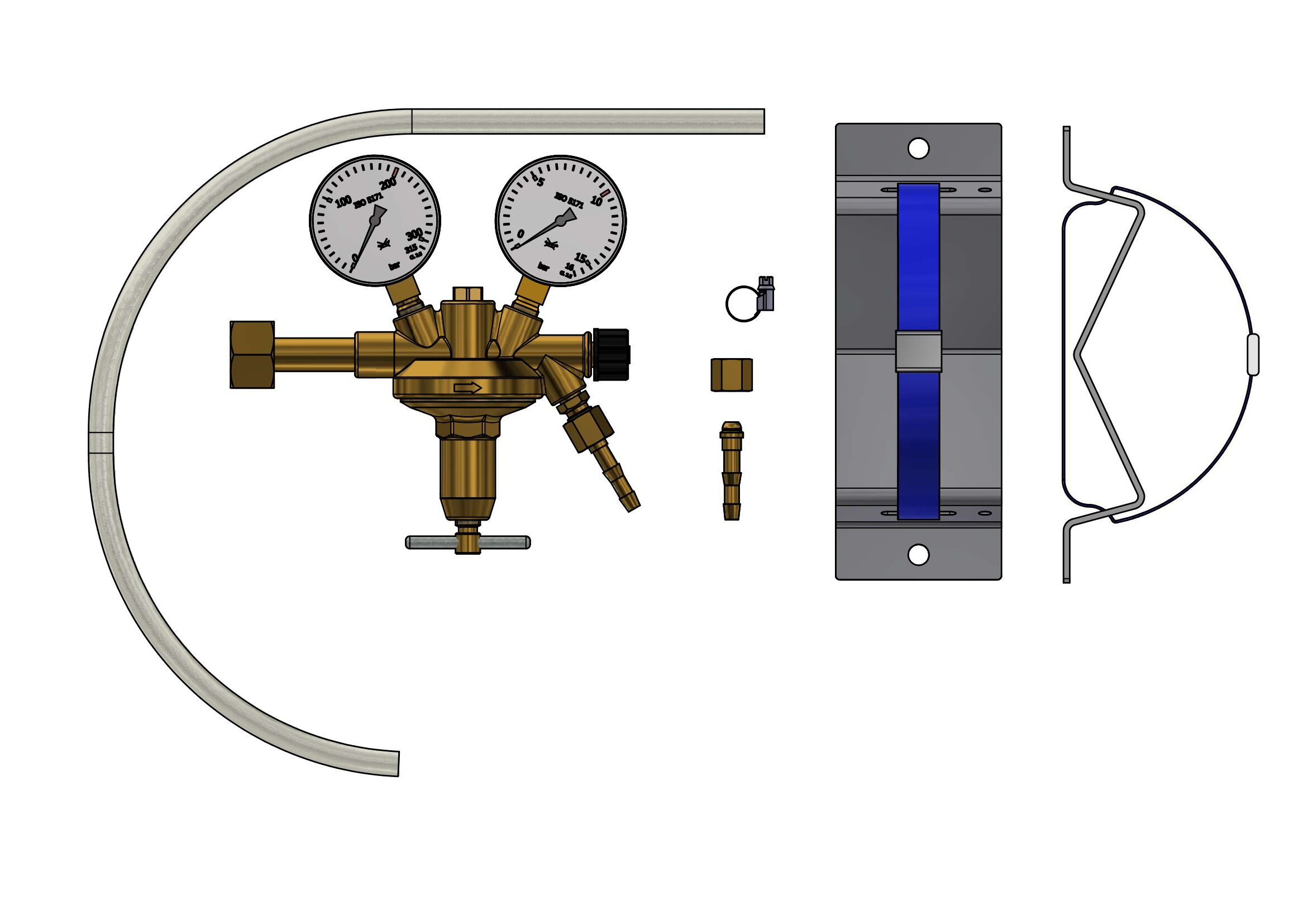 with metal diaphragm, 5m hose #400 206 01, 2 hose clamp VA #400 223, 1 tail piece #402 003, 1 nut #402 021, 1 cylinder rack #410 040 01, complete blistered with label "free of oil and grease" with operating manual Linde in box