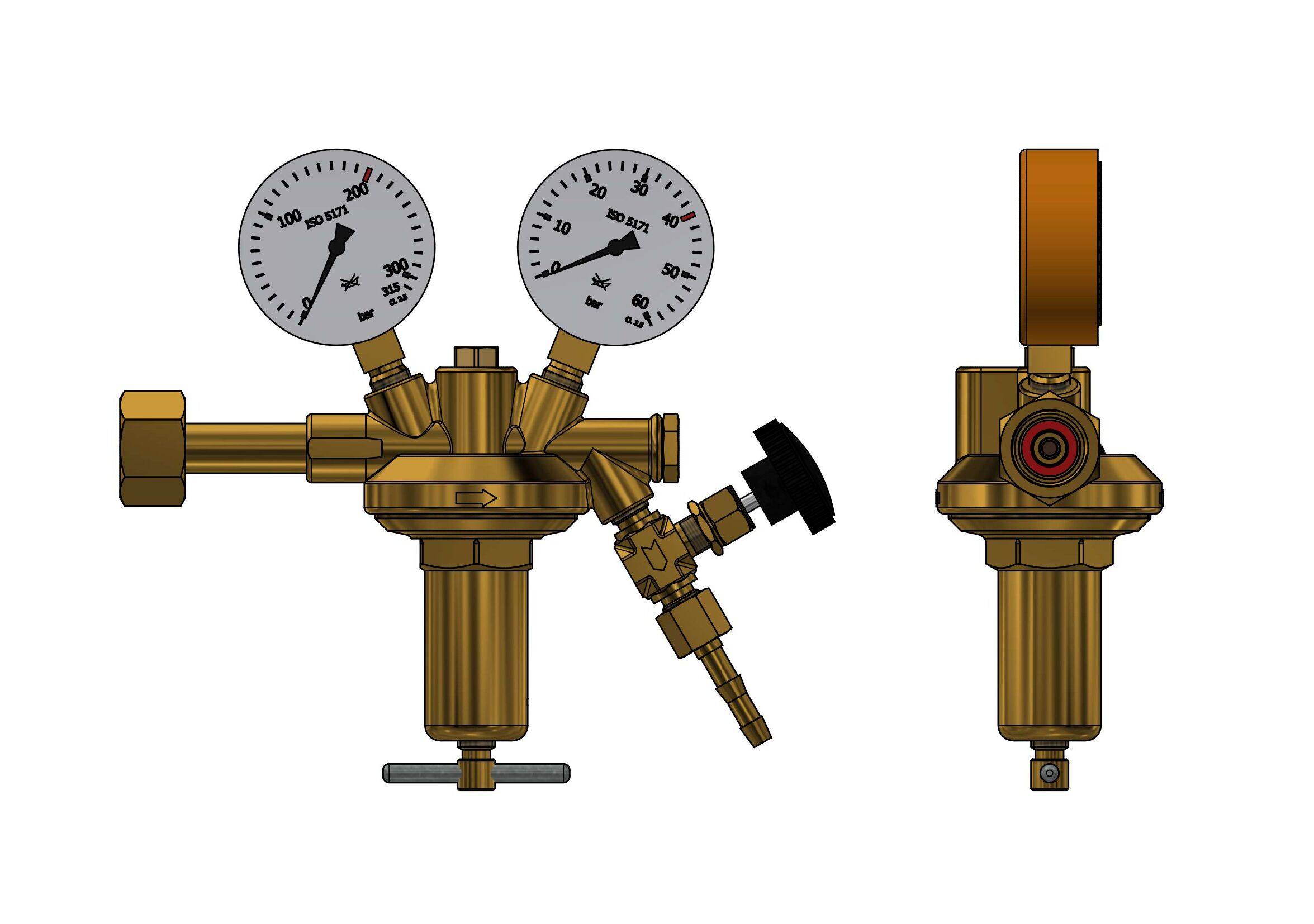 acc to DIN EN ISO 2503, single stage, with high pressure compensation for a constant working pressure on falling inlet pressure with safety gauges acc. to DIN ISO 5171inlet pressure max:200 bar