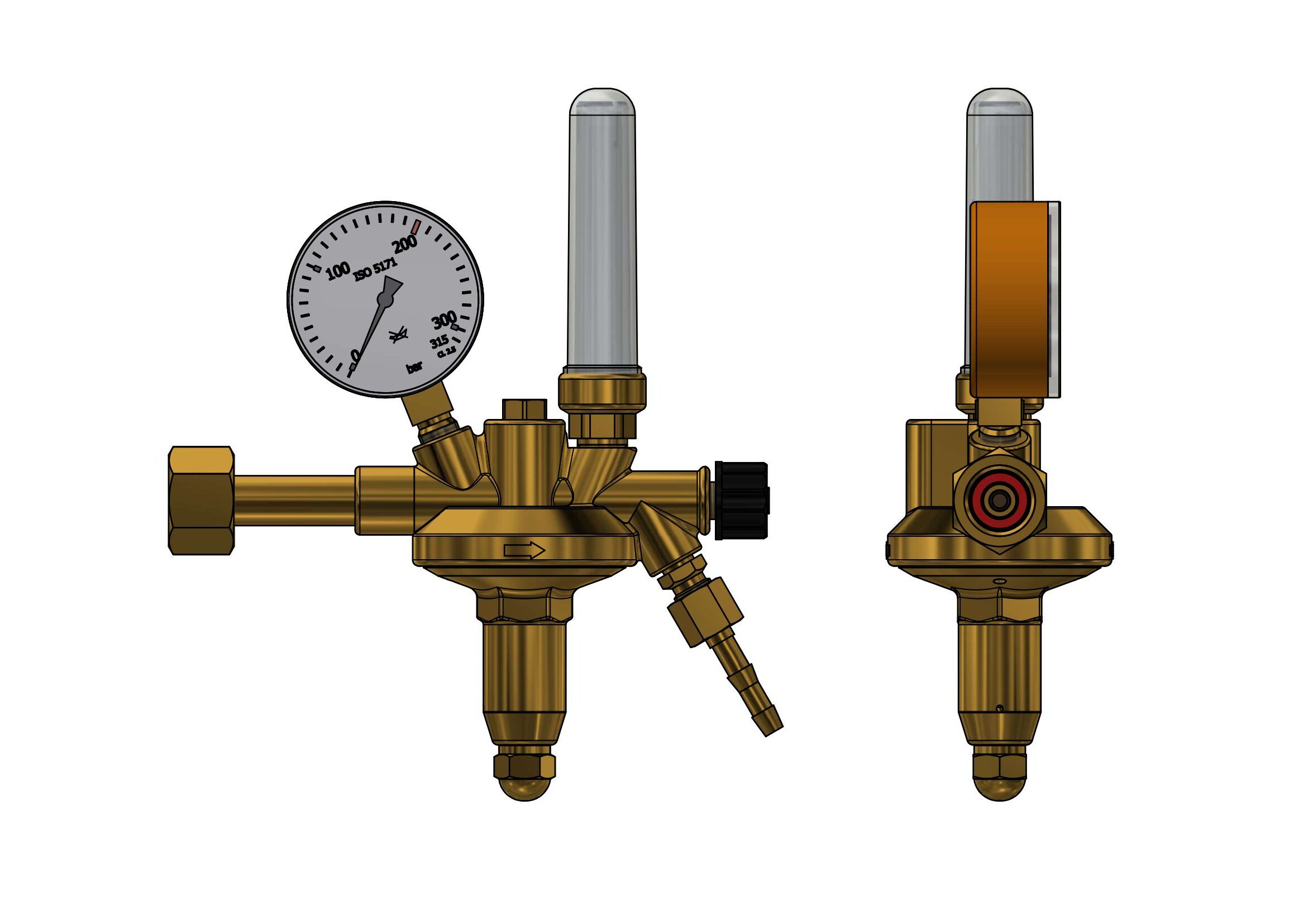 acc to DIN EN ISO 2503, class 10, single stage with flowmeter, with high pressure compensation for a constant working pressure on falling inlet pressure with safety gauges acc. to DIN ISO 5171inlet pressure max: 200 bar