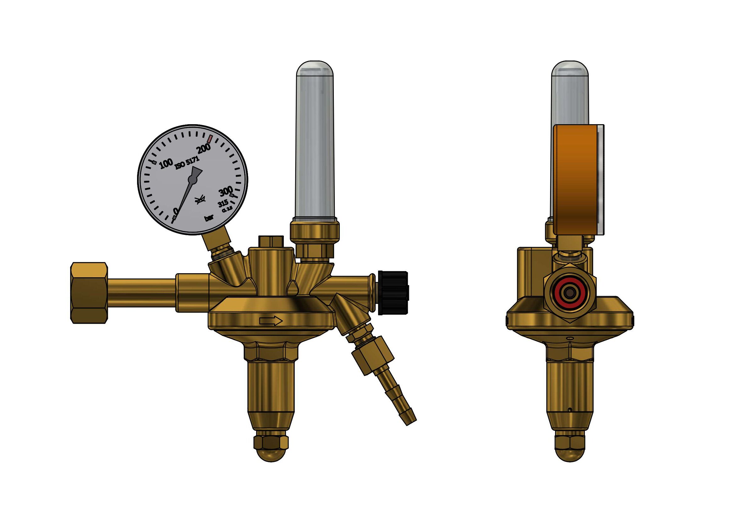 acc to ISO 2503, class 20, single stage, with flowmeter for exact control of the flow in Nl/min, with high pressure compensation for constant working pressure with safety gauge acc. to ISO 5171, with shut off valveinlet pressure max: 200 bar