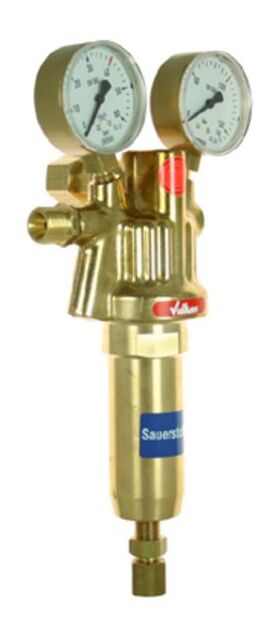 Ribbed tapping point regulator Vulkan TecLine ER40, single stage. Brass body, stainless steel diaphragm, PTFE seals. Gas purity up to 4.5. Safety gauges acc. to DIN EN ISO 5171. Inlet pressure max 100 bar. Outlet pressure 15–40 bar (adjustable). Inlet: G 1/2 RH (right-hand) nut acc. to EN 560. Outlet: G 1/2 RH x 9 mm hose nozzle. Dimensions: 180 × 225 × 75 mm, weight 1.7 kg.