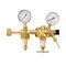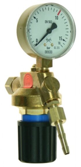 Tapping point regulator Vulkan TecLine E10, single stage. Brass body, Perbunan diaphragm and seals. Gas purity up to 4.5. Safety gauges acc. to DIN EN ISO 5171. Inlet pressure max 20 bar. Outlet pressure 0–10 bar (adjustable). Max. flow 46 Nm³/h at 10 bar back pressure. Inlet: G 3/8 RH (right-hand) nut acc. to EN 560. Outlet: G 1/4 RH x 6 mm hose nozzle. LP gauge: 0–16 bar. Dimensions: 120 × 160 × 65 mm, weight 1.0 kg.