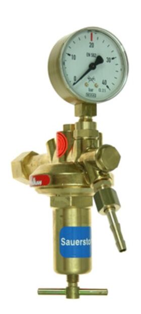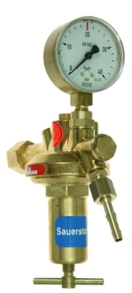 Tapping point regulator Vulkan TecLine E20, single stage. Brass body, EPDM/PTFE diaphragm, EPDM seals. Gas purity up to 4.5. Safety gauges acc. to DIN EN ISO 5171. Inlet pressure max 40 bar. Outlet pressure 0–20 bar (adjustable). Max. flow 75 Nm³/h at 20 bar back pressure. Inlet: G 1/2 RH (right-hand) nut acc. to EN 560. Outlet: G 1/2 RH x 9 mm hose nozzle. LP gauge: 0–25 bar. Dimensions: 180 × 225 × 75 mm, weight 1.7 kg.