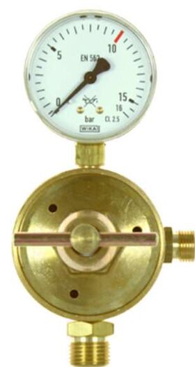 Working pressure reducer Vulkan AD 35 nitrogen 0 - 10 bar for AM 35, single-stage design, with safety pressure gauge according to DIN EN ISO 5171. Maximum inlet pressure: 20 bar. Output pressure: 0 - 10 bar, adjustable. Maximum output: 50 Nm³/h air at 10 bar outlet pressure. Inlet: G1/2" male thread, threaded connection according to DIN EN 560. Outlet: G3/8" male thread, threaded connection according to DIN EN 560. Outlet pressure gauge: 0 - 16/10 bar. Width x Height x Depth: 89 x 166 x 134 mm. This line pressure reducer is available in the following versions: Gas purity/diaphragm: Standard: - for technical gases up to a gas purity of 4.5 with a standard diaphragm. Optional (surcharge): - for pure gases up to a gas purity of 5.0 with a stainless steel diaphragm. SS321 (1.4541)