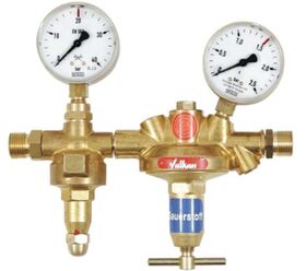 Vulkan L10/2N line pressure reducer for compressed air G1/2RHak both sides 0 - 1.5 bar, two-stage design, with safety pressure gauges according to DIN EN ISO 5171. Maximum inlet pressure: 20 bar. Output pressure: 0 - 1.5 bar, adjustable. Maximum output: 5 Nm³/h air at 1.5 bar outlet pressure. Inlet: external thread G1/2RHak, Outlet: external thread G1/2RHak, Inlet pressure gauge: 0 - 40/20 bar, Outlet pressure gauge: 0 - 2.5/1.5 bar, Width x Height x Depth: 220 x 190 x 75 mm. This line pressure reducer is available in the following versions, among others: Gas purity/diaphragm: Standard: - for technical gases up to a gas purity of 4.5 with standard diaphragm. Optional (surcharge): - for Pure gases up to a gas purity of 5.0 with stainless steel membrane SS321 (1.4541) Special outlet screw connection: Standard: - external thread G1/2" RHk on both sides according to EN 56 Options (surcharge): Order number Gas purity/Membrane Inlet/outlet screw connection 107564 for technical gases up to 4.5, with standard membrane on both sides. external thread G1/2" RHk according to EN 560 107564-6M-6M for technical gases up to 4.5, with standard membrane on both sides. Compression fitting VA 6mm 107564-8M-8M for technical gases up to 4.5, with standard membrane on both sides. Compression fitting VA 8mm 107564-10M-15M for technical gases up to 4.5, with standard membrane on both sides. Compression fitting VA 10 mm 107564-12M-15M for technical gases up to 4.5, with standard membrane on both sides. Stainless steel compression fitting 12 mm 107564-15M-15M for technical gases up to 4.5, with standard membrane on both sides. Stainless steel compression fitting 15 mm 107564-18M-18M for technical gases up to 4.5, with standard membrane on both sides. Stainless steel compression fitting 18 mm 107564-MM for pure gases up to 5.0, with metal membrane SS321 (1.4541) on both sides. External thread G1/2" RHk according to EN 560 107564-MM-6M-6M for pure gases up to 5.0, with metal membrane SS321 (1.4541) on both sides. Stainless steel compression fitting 6 mm 107564-MM-8M-8M for pure gases up to 5.0, with metal membrane SS321 (1.4541) on both sides. 8mm stainless steel compression fitting 107564-MM-10M-10M for pure gases up to 5.0, with metal membrane SS321 (1.4541) on both sides. 10mm stainless steel compression fitting 107564-MM-12M-12M for pure gases up to 5.0, with metal membrane SS321 (1.4541) on both sides. 12mm stainless steel compression fitting 107564-MM-15M-15M for pure gases up to 5.0, with metal membrane SS321 (1.4541) on both sides. 15mm stainless steel compression fitting 107564-MM-18M-18M for pure gases up to 5.0, with metal membrane SS321 (1.4541) on both sides. Compression fitting VA 18 mm