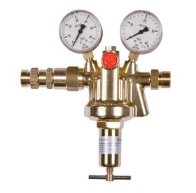 In-line ribbed pressure reducer Vulkan LR20 Effect oxygen, 0 - 20 bar based on ISO 7291, single-stage design, with pre-pressure compensation for constant back pressure with falling pre-pressure, with safety pressure gauges according to ISO 5171, max. inlet pressure: 40 bar, outlet pressure: 0 - 20 bar adjustable, max. output: 160 Nm³/h air at 20 bar back pressure. Inlet: external thread G3/4RHak - EN560, outlet: external thread G3/4RHak - EN560, inlet pressure gauge: 0 - 60/40 bar, outlet pressure gauge: 0 - 40/20 bar, width x height x depth: 220 x 240 x 85 mm. This in-line ribbed pressure reducer is available in the following versions, among others: Gas purity/diaphragm: Standard: - for technical gases up to a gas purity of 4.5 with standard membrane Optional (surcharge): - for pure gases up to a gas purity of 5.0 with stainless steel membrane SS321 (1.4541) Special outlet screw connection: Standard: - external thread G3/4" RHak on both sides according to EN 560 Options (surcharge): Order number Gas purity/Membrane Inlet/outlet screw connection 108627 for technical gases up to 4.5, with standard membrane on both sides. external thread G3/4" RHak according to EN 560 108627-12M-12M for technical gases up to 4.5, with standard membrane on both sides. compression fitting VA 12mm 108627-15M-15M for technical gases up to 4.5, with standard membrane on both sides. compression fitting VA 15mm 108627-18M-18M for technical gases up to 4.5, with standard diaphragm on both sides. 18 mm stainless steel compression fitting. 108627-MM for pure gases up to 5.0, with metal diaphragm made of SS321 (1.4541) on both sides. G3/4" male thread RHak according to EN 560. 108627-MM-12M-12M for pure gases up to 5.0, with metal diaphragm made of SS321 (1.4541) on both sides. 12 mm stainless steel compression fitting. 108627-MM-15M-15M for pure gases up to 5.0, with metal diaphragm made of SS321 (1.4541) on both sides. 15 mm stainless steel compression fitting. 108627-MM-18M-18M for pure gases up to 5.0, with metal diaphragm made of SS321 (1.4541) on both sides. SS321 (1.4541) both sides compression fitting VA 18 mm