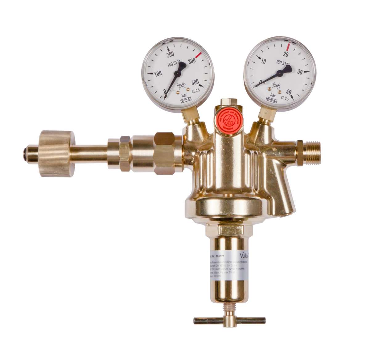 Main ribbed pressure reducer Vulkan HR20/200 EFFECT oxygen, 0-20 bar, 170 Nm?/h according to DIN EN ISO 7291, single-stage design, with pre-pressure compensation for constant back pressure under all working conditions, burnout tested according to ISO 7291, with safety gauges according to ISO 5171. Maximum inlet pressure: 200 bar. Output pressure: 0 - 20 bar adjustable. Maximum output: 170 Nm?/h compressed air at 20 bar back pressure. Inlet: G3/4 RHf U-nut according to DIN 477-1, No. 9. Outlet: G 1/2 RHak according to EN 560. Inlet pressure gauge: 0 - 315/200 bar. Outlet pressure gauge: 0 - 40/20 bar. Width x Height x Depth: 240 x 240 x 85 mm. This main ribbed pressure reducer is Available in the following versions, among others: Gas purity/membrane: Standard: - for technical gases up to a gas purity of 4.5 with standard membrane Optional (surcharge): - for pure gases up to a gas purity of 5.0 with stainless steel membrane SS321 (1.4541) Special outlet screw connection: Standard: - G1/2RHak according to EN 560 Options (surcharge): Item number Gas purity Outlet connection 208527 for technical gases up to 4.5, with standard membrane G1/2RHak according to EN 560 208527-800 for technical gases up to 4.5, with standard membrane External thread G1/4" RHk according to EN560 208527-870 for technical gases up to 4.5, with standard membrane External thread G3/8" RHk according to EN 560 208527-6M for technical gases up to 4.5, with standard membrane compression fitting VA 6mm 208527-8M for technical gases up to 4.5, with standard membrane compression fitting VA 8mm 208527-10M for technical gases up to 4.5, with standard membrane compression fitting VA 10mm 208527-12M for technical gases up to 4.5, with standard membrane compression fitting VA 12mm 208527-15M for technical gases up to 4.5, with standard membrane compression fitting VA 15mm 208527-18M for technical gases up to 4.5, with standard membrane compression fitting VA 18mm 208527-MM for pure gases up to 5.0, with metal membrane SS321 (1.4541) G1/2RHak according to EN 560 208527-MM-800 for pure gases up to 5.0, with metal membrane SS321 (1.4541) external thread G1/4" RHk according to EN560 208527-MM-870 for pure gases up to 5.0, with metal membrane SS321 (1.4541) external thread G3/8" RHk according to EN 560 208527-MM-6M for pure gases up to 5.0, with metal membrane SS321 (1.4541) compression fitting VA 6mm 208527-MM-8M for pure gases up to 5.0, with metal membrane SS321 (1.4541) compression fitting VA 8mm 208527-MM-10M for pure gases up to 5.0, with metal membrane SS321 (1.4541) Compression fitting VA 10mm 208527-MM-12M for pure gases up to 5.0, with metal membrane SS321 (1.4541) Compression fitting VA 12mm 208527-MM-15M for pure gases up to 5.0, with metal membrane SS321 (1.4541) Compression fitting VA 15mm 208527-MM-18M for pure gases up to 5.0, with metal membrane SS321 (1.4541) Compression fitting VA 18mm