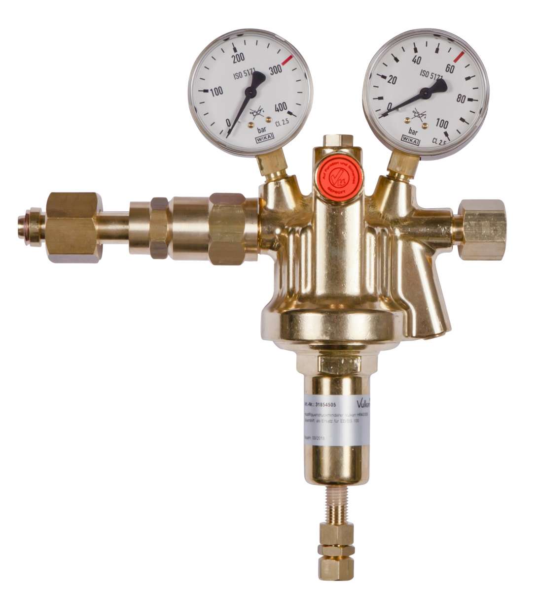 Main ribbed pressure reducer Vulkan HR60/300 EFFECT inert gas, DIN 477-5, 15-60 bar according to ISO 7291, single-stage design, with pre-pressure compensation for constant back pressure with falling pre-pressure, with safety gauges according to ISO 5171. Inlet pressure max: 300 bar. Outlet pressure: 15 – 60 bar adjustable. Output max: 450 Nm³/h compressed air at 60 bar back pressure. Inlet: W 30x2 RH U-nut according to DIN 477-5, No. 54. Outlet: G 1/2 RHak according to DIN EN 560. Inlet pressure gauge: 0 – 400/300 bar. Outlet pressure gauge: 0 – 100/60 bar. Width x Height x Depth: 240 x 330 x 85 mm. Important note for 300 bar pressure reducers - please check your Cylinder connection! Cylinder pressure regulators for 300 bar have a manual connection according to DIN 477 Part 5 and are NOT backward compatible. This means they do NOT fit cylinders with a maximum filling pressure of 200 bar! If necessary, see our following tutorial, 3: Difference between 200 bar and 300 bar pressure regulators. This main ribbed pressure reducer is available in the following versions, among others: Gas purity/diaphragm: Standard: - for technical gases up to a gas purity of 4.5 with standard diaphragm Optional (surcharge): - for pure gases up to a gas purity of 5.0 with stainless steel diaphragm SS321 (1.4541) Special outlet screw connection: Standard: - G1/2RHak according to EN 560 Options (surcharge): Item number Gas purity Outlet connection 306568 for technical gases up to 4.5, with standard diaphragm G1/2RHak according to EN 560 306568-800 for technical gases up to 4.5, with standard diaphragm external thread G1/4" RHk according to EN560 306568-870 for technical gases up to 4.5, with standard diaphragm external thread G3/8" RHk according to EN 560 306568-6M for technical gases up to 4.5, with standard membrane, compression fitting made of stainless steel 6mm 306568-8M for technical gases up to 4.5, with standard membrane, compression fitting made of stainless steel 8mm 306568-10M for technical gases up to 4.5, with standard membrane, compression fitting made of stainless steel 10mm 306568-12M for technical gases up to 4.5, with standard membrane, compression fitting made of stainless steel 12mm 306568-15M for technical gases up to 4.5, with standard membrane, compression fitting made of stainless steel 15mm 306568-18M for technical gases up to 4.5, with standard membrane, compression fitting made of stainless steel 18mm 306568-MM for pure gases up to 5.0, with metal membrane made of SS321 (1.4541) G1/2RHak according to EN 560 306568-MM-800 for pure gases up to 5.0, with metal membrane SS321 (1.4541) external thread G1/4" RHk according to EN560 306568-MM-870 for pure gases up to 5.0, with metal membrane SS321 (1.4541) external thread G3/8" RHk according to EN 560 306568-MM-6M ​​for pure gases up to 5.0, with metal membrane SS321 (1.4541) compression fitting VA 6mm 306568-MM-8M for pure gases up to 5.0, with metal membrane SS321 (1.4541) compression fitting VA 8mm 306568-MM-10M for pure gases up to 5.0, with metal membrane SS321 (1.4541) compression fitting VA 10mm 306568-MM-12M for pure gases up to 5.0, with metal membrane SS321 (1.4541) compression fitting VA 12mm 306568-MM-15M for pure gases up to 5.0, with metal membrane SS321 (1.4541) compression fitting VA 15mm 306568-MM-18M for pure gases up to 5.0, with metal membrane SS321 (1.4541) compression fitting VA 18mm