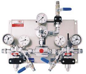Automatic switching manifold Vulkan LabLine AM 35/300 Effect, chrome-plated. Complete on stainless steel base plate: 2× manifold regulator H20 Effect acc. to ISO 7291, 2× ND-purge valves, 1× in-line regulator AD 35, 1× automatic change-over block, 1× main shut-off valve, without contact gauge. Inlet max 300 bar, outlet 0–10 bar, max flow 50 Nm³/h at 10 bar. Stainless steel diaphragm, gas purity up to 5.0. Dimensions: 450 × 420 × 210 mm.