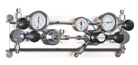 Compact single-stage semi-automatic pressure control station (manifold) for two cylinders, designed for technical, medical, corrosive, laboratory and high-purity gases. Features automatic switchover via pressure difference between two connected cylinders — when one cylinder is depleted, the system automatically switches to the full cylinder. Equipped with 2 main single-stage pressure regulators (one per side), inlet and outlet pressure gauges (Ø 50 mm, DIN 837), 50 µm inlet filter and relief valve. Includes 2 stainless steel corrugated metal hoses (1,000 mm) for cylinder connection. Completely mounted on a stainless steel base plate with fixing holes. Inlet: cylinder connection according to DIN 477 Part 1 or Part 5. Outlet: compression fitting or alternatively 1/4" NPT-F thread. Maximum inlet pressure up to 300 bar depending on standard. Outlet pressure ranges from 1.5 to 30 bar; special ranges up to 60 bar. Temperature range: -40 to +70 °C. Body materials: chrome-plated brass, stainless steel or Monel. Diaphragm: stainless steel or Hastelloy. Seat: PCTFE. ECD suitable. Leak rate < 1×10⁻⁸ mbar·l/s (He). ATEX and PED compliant. Options: shut-off or metering valve, purge system, contact gauge or pressure transmitter.