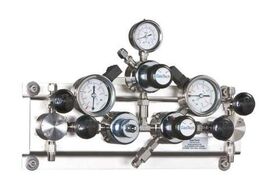 Compact two-stage semi-automatic pressure control station (manifold) for two cylinders, designed for technical, medical, corrosive, laboratory and high-purity gases. Two-stage regulation ensures highly stable outlet pressure. Features automatic switchover via pressure difference — when one cylinder is depleted, the system automatically switches to the full cylinder. Equipped with 2 main two-stage pressure regulators (one per side), inlet and outlet pressure gauges (Ø 50 mm, DIN 837), 50 µm inlet filter and relief valve per stage. Includes 2 stainless steel corrugated metal hoses (1,000 mm) for cylinder connection. Completely mounted on a stainless steel base plate with fixing holes. Inlet: cylinder connection according to DIN 477 Part 1 or Part 5. Outlet: compression fitting or alternatively 1/4" NPT-F thread. Maximum inlet pressure up to 300 bar depending on standard. Outlet pressure ranges from 1.5 to 30 bar; special ranges up to 60 bar. Temperature range: -40 to +70 °C. Body materials: chrome-plated brass, stainless steel or Monel. Diaphragm: stainless steel or Hastelloy. Seat: PCTFE. ECD suitable. Leak rate < 1×10⁻⁸ mbar·l/s (He). ATEX and PED compliant. Options: shut-off or metering valve, purge system, contact gauge or pressure transmitter.