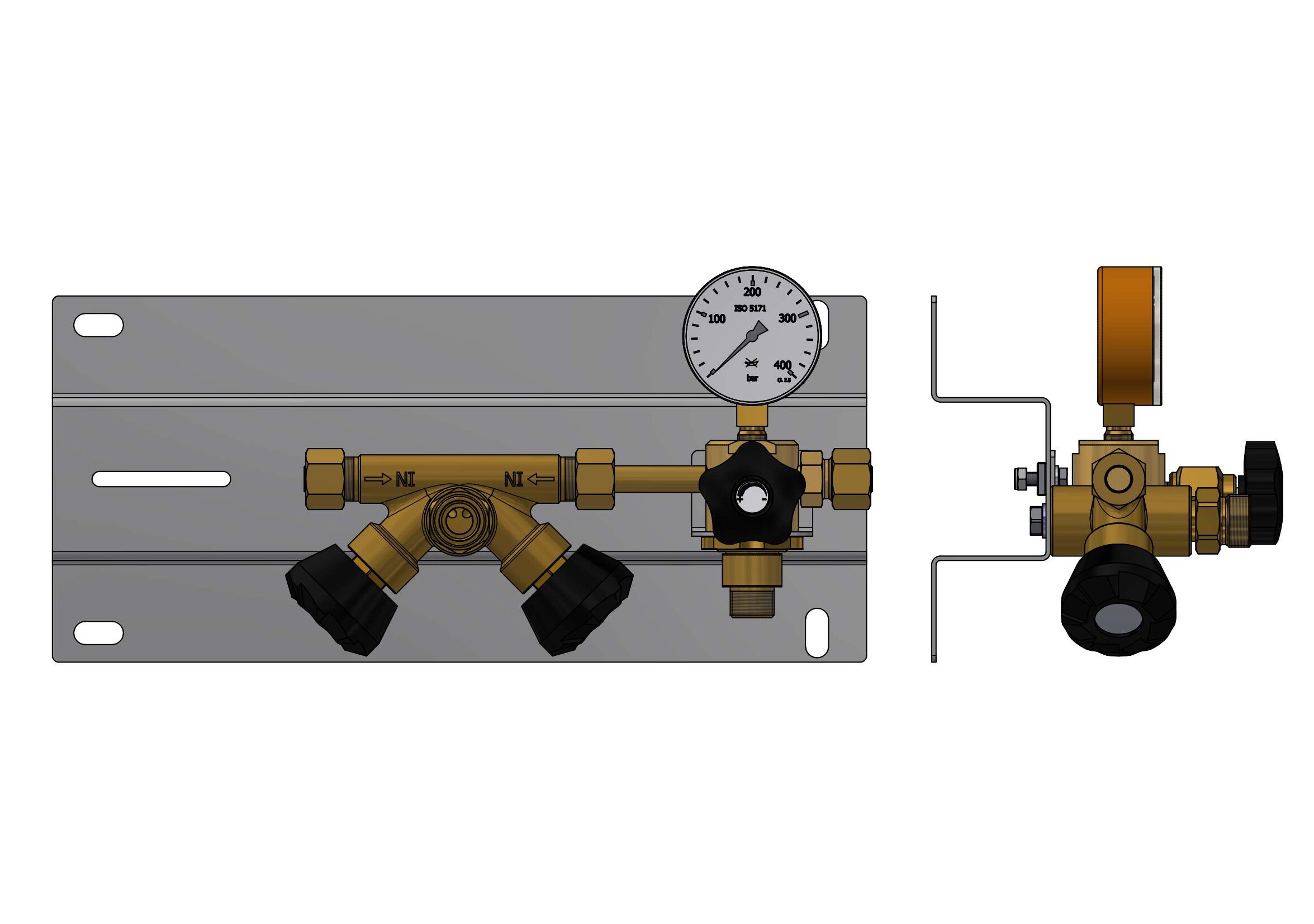 free of oil- and grease, for inert gas, fuel gas and oxygen, adiabatic compression tested,consisting of: HP double shut-off valve, with an input with sintered filter, non-return valve, purge valve and high-pressure gauge and connection for a cylinder/bundle manifold module, completely mounted on stainless steel base plate