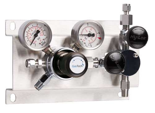 Compact single-stage pressure control station (manifold) for one cylinder, designed for technical, medical, corrosive, laboratory and high-purity gases. Equipped with one main pressure regulator, inlet and outlet pressure gauges (Ø 50 mm, DIN 837), 50 µm inlet filter and relief valve. Includes one stainless steel corrugated metal hose, 1,000 mm long, for cylinder connection. Completely mounted on a stainless steel base plate with fixing holes. Inlet: cylinder connection according to DIN 477 Part 1 or Part 5. Outlet: compression fitting or alternatively 1/4" NPT-F thread. Maximum inlet pressure up to 300 bar depending on standard. Outlet pressure ranges from 1.5 to 30 bar; special ranges up to 60 bar are possible. Temperature range: -40 to +70 °C. Body materials: chrome-plated brass, stainless steel or Monel. Membranes: stainless steel or Hastelloy. ECD suitable. Leak rate < 1×10^-8 (helium). ATEX and PED compliant. Options include shut-off or metering valve, purge system and contact gauge or pressure transmitter.