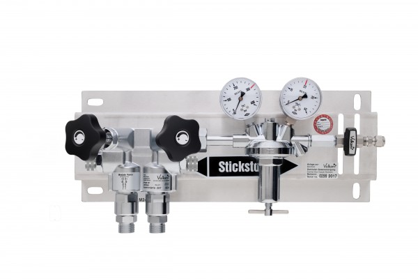 Manual manifold base station Vulkan LabLine BS 50/300 Effect, chrome-plated. Modular add-on system (Modula Vareo). Manual switching. Complete on stainless steel base plate: 1× distributing block, 1× manifold regulator H10 acc. to ISO 7291, 1× main shut-off valve, with purge valves. Inlet max 300 bar, outlet 0–10 bar. Max. flow 50 Nm³/h. Stainless steel diaphragm. Gas purity up to 5.0. Dimensions: 570 × 250 × 210 mm, 10 kg.