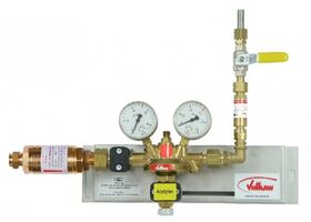 Single-cylinder manifold station Vulkan LabLine SE 10/300 Effect (with standard gauges), chrome-plated. Modular add-on system. Manual switching. Complete on stainless steel base plate: 1× HP shut-off valve, 1× manifold regulator H10 single stage acc. to ISO 7291, 1× main shut-off valve, 1× purge valve, 1× cylinder rack. Inlet max 300 bar, outlet 0–10 bar. Max. flow 50 Nm³/h at 10 bar. Stainless steel diaphragm, gas purity up to 5.0. Dimensions: 420 × 280 × 110 mm.