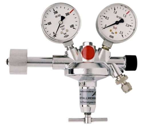 single-stage design, with shut-off valve, with safety gauges according to DIN EN ISO 5171, maximum inlet pressure: 200 bar, adjustable outlet pressure: 0-1