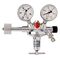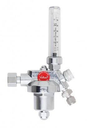 Tapping point regulator Vulkan LabLine E10F for oxygen, single stage with integrated flowmeter and regulating valve for precise flow control. Chrome-plated brass body, stainless steel diaphragm, EPDM seals. Gas purity up to 5.0. Leakage rate 1×10⁻⁶ mbar·l/s. Inlet pressure max 200 bar. Outlet pressure 5.0 bar (fixed). Flow range 1.0–15.0 Nl/min (adjustable). Inlet: G 3/8 RH (right-hand) nut acc. to EN 560. Outlet: stainless steel clamp ring fitting 6 mm. Dimensions: 120 × 220 × 65 mm, weight 1.0 kg.