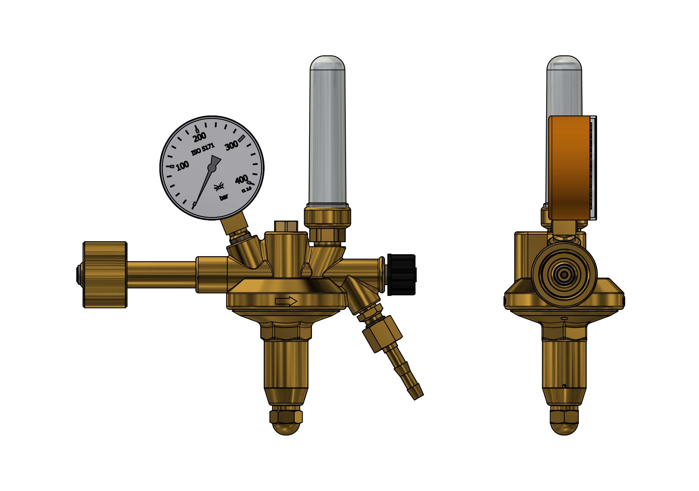 acc to EN 13918, class 10, single stage, with flowmeter for exact control of the flow in Nl/min, TÜV – approved following Pressure equipment Directive 97/23/EG with high pressure compensation for constant working pressure with safety gauge acc. to ISO 5171, with shut off valveinlet pressure max: 300 bar