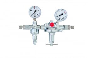 In-line regulator Vulkan LabLine L10/2, double stage, chrome-plated body with stainless steel diaphragm for gas purity up to 5.0. With safety gauges acc. to DIN EN ISO 5171. Inlet pressure max 20 bar, outlet pressure 0–10 bar adjustable. Max. flow 30 Nm³/h at 10 bar. Inlet: clamp ring 8 mm. Outlet: clamp ring 8 mm. Dimensions: 240 × 190 × 75 mm, 2.0 kg.