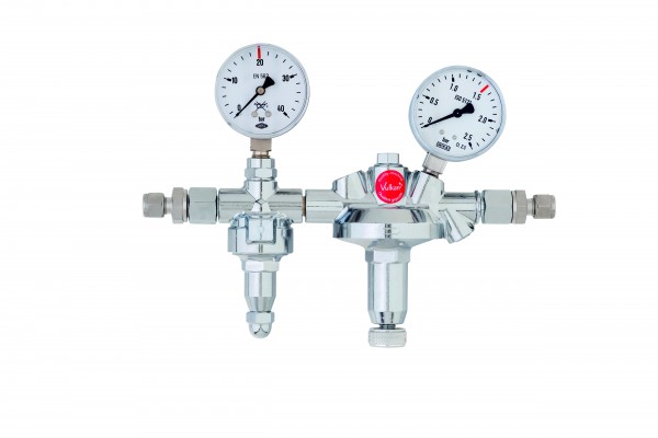In-line regulator Vulkan LabLine L15/2, double stage, chrome-plated body with stainless steel diaphragm for gas purity up to 5.0. With safety gauges acc. to DIN EN ISO 5171. Inlet pressure max 20 bar, outlet pressure 0–1.5 bar adjustable. Max. flow 8 Nm³/h at 1.5 bar. Inlet: clamp ring 8 mm. Outlet: clamp ring 8 mm. Dimensions: 240 × 190 × 75 mm, 2.0 kg.