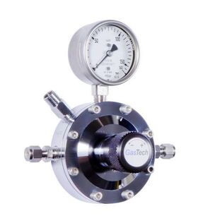 Compact single-stage line fine pressure regulator type Omega I in accordance with ISO 2503 for technical, medical, corrosive, laboratory and high-purity gases. Designed for precise millibar-range outlet pressure control. Features: compact design with high control accuracy; inlet and outlet: 1/4" NPT-F, alternatively compression fitting; outlet pressure gauge Ø 63 mm; 50 µm inlet filter; relief valve; gas purity up to 6.0; temperature range -40 to +70 °C; body materials: chrome-plated brass, stainless steel or Monel; diaphragm: stainless steel or Hastelloy; seat: PCTFE; ECD compatible; ATEX compliant (94/9/EG); PED compliant (97/23/EG). Options: inlet pressure gauge, shut-off or metering valve, gas purging system (internal or external), contact gauge or pressure transmitter.