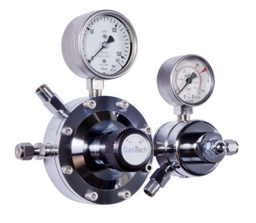 Compact two-stage line fine pressure regulator type Omega II in accordance with ISO 2503 for technical, medical, corrosive, laboratory and high-purity gases. Two-stage design provides exceptionally stable millibar-range outlet pressure. Features: compact design with high control accuracy; inlet and outlet: 1/4" NPT-F, alternatively compression fitting; outlet pressure gauge Ø 63 mm; 50 µm inlet filter; 2 relief valves (one per stage); gas purity up to 6.0; temperature range -40 to +70 °C; body materials: chrome-plated brass, stainless steel or Monel; diaphragm: stainless steel or Hastelloy; seat: PCTFE; ECD compatible; ATEX compliant (94/9/EG); PED compliant (97/23/EG). Options: inlet pressure gauge, shut-off or metering valve, gas purging system (internal or external), contact gauge or pressure transmitter.