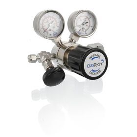 Compact single-stage cylinder pressure regulator type Thanos in accordance with ISO 2503 for technical, medical, corrosive, laboratory and high-purity gases. Features: compact design, high control accuracy, inlet (right) with cylinder connection per DIN 477-1 or DIN 477-5, alternatively 1/4" NPT-F; outlet: compression fitting or threaded fitting; inlet pressure gauge and outlet pressure gauge Ø 50 mm (DIN EN 837); 74 µm inlet filter; relief valve; gas purity up to 6.0; temperature range -20 to +60 °C; body materials: nickel-plated brass or stainless steel 316L; diaphragm: stainless steel 316L; seat: PCTFE; leak rate < 2×10⁻⁸ mbar·l/s (He); compliant with 2014/68/EU (PED) and 2014/34/EU (ATEX). Options: shut-off or metering valve, purge system (internal or external), contact gauge or pressure transmitter.