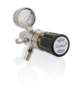 Compact two-stage cylinder pressure regulator type Thanos II in accordance with ISO 2503 for technical, medical, corrosive, laboratory and high-purity gases. Two-stage design provides absolutely constant outlet pressure even as cylinder pressure decreases. Features: compact design, high control accuracy, inlet (right) with cylinder connection per DIN 477-1 or DIN 477-5, alternatively 1/4" NPT-F; outlet: compression fitting or threaded fitting; inlet and outlet pressure gauges Ø 50 mm (DIN EN 837); 74 µm inlet filter; relief valve; gas purity up to 6.0; temperature range -20 to +60 °C; body materials: nickel-plated brass or stainless steel 316L; diaphragm: stainless steel 316L; seat: PCTFE; leak rate < 2×10⁻⁸ mbar·l/s (He); compliant with 2014/68/EU (PED) and 2014/34/EU (ATEX). Options: shut-off or metering valve, purge system (internal or external), contact gauge or pressure transmitter.